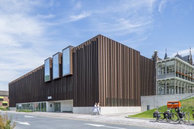 Der vorgesehene Standort, an einem Hang liegend mit Aussicht auf die typische limburgische Landschaft, bot sich dafür an, den geplanten Gebäudekomplex in eine Böschung zu integrieren. Am oberen Rand des Hügels, auf der Höhe des Valkenburgweg, wurden rund um einen großen Patio sechs schalenförmige Gebäude campusartig angeordnet. Unter der Gebäudeformation befinden sich eine Tiefgarage und die Klassenräume, die von jeder Fachrichtung genutzt werden können und somit dem Anspruch der flexibel-einsetzbaren Unterrichtsräume gerecht werden. Zum Tal hin öffnen sich die Räume mit großen Fensterfronten, die für viel Tageslicht sorgen und einen weiten Ausblick über die Landschaft ermöglichen.