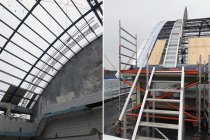 Die Kuppel der Melkhal wurde 1965 als Leichtbaudach errichtet, bestehend aus parabelförmigen Stahlfachwerkträgern mit Pfetten und eingedeckt mit lichtdurchlässigen Kunststoff-Wellblechen. Das Dach der Halle (25,3m …