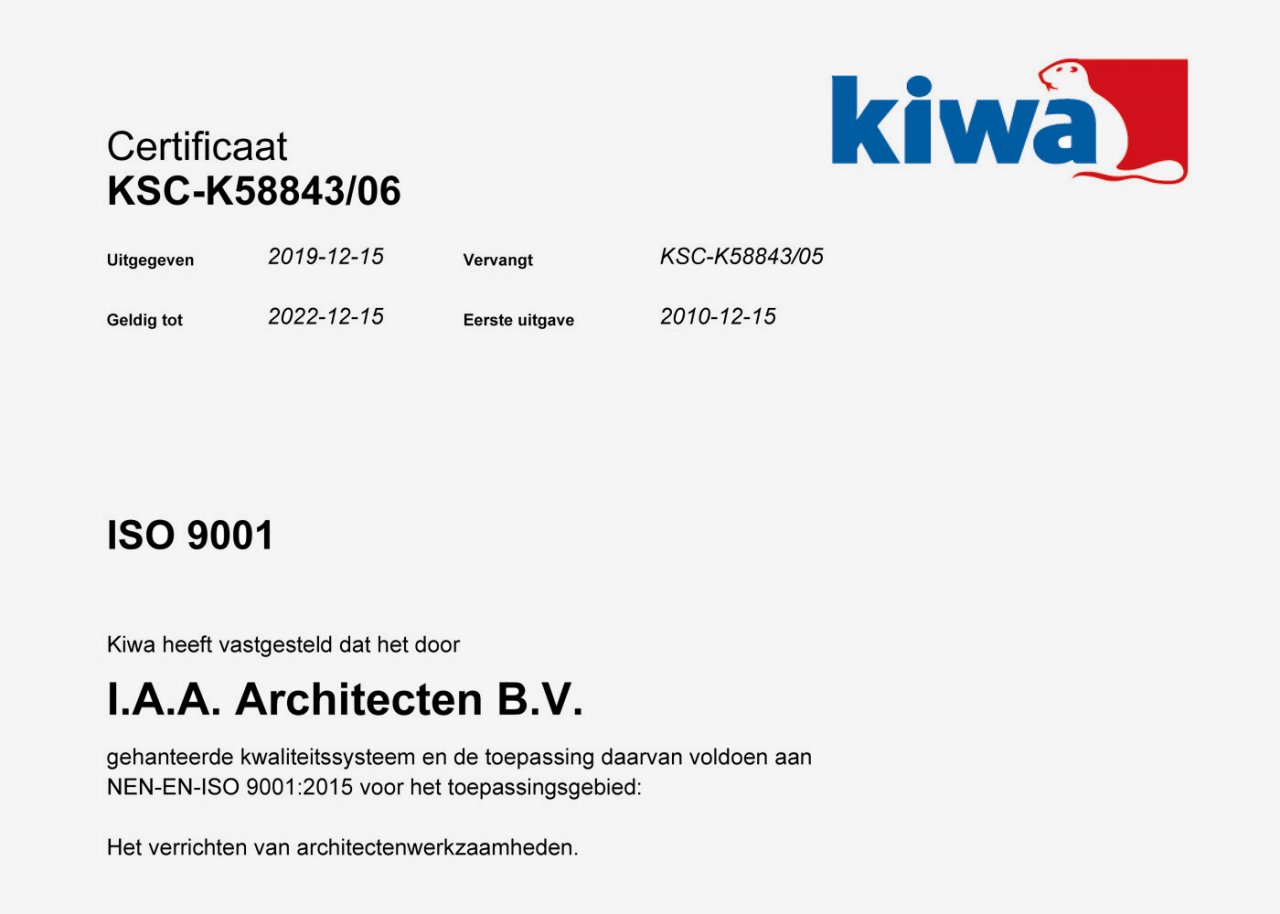 Nach dem positiv verlaufenden Audit durch Kiwa sind wir stolz darauf, dass IAA Architecten erneut die Zertifizierung nach NEN-EN-ISO 9001, Version 2015.