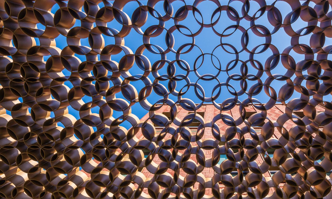 Aneinander gekettet formen die 1252 Rohre ein goldenes Blumenmuster, dass vor dem einfallenden Sonnenlicht schützt während es von der Unterseite betrachtet vollständig offen ist.