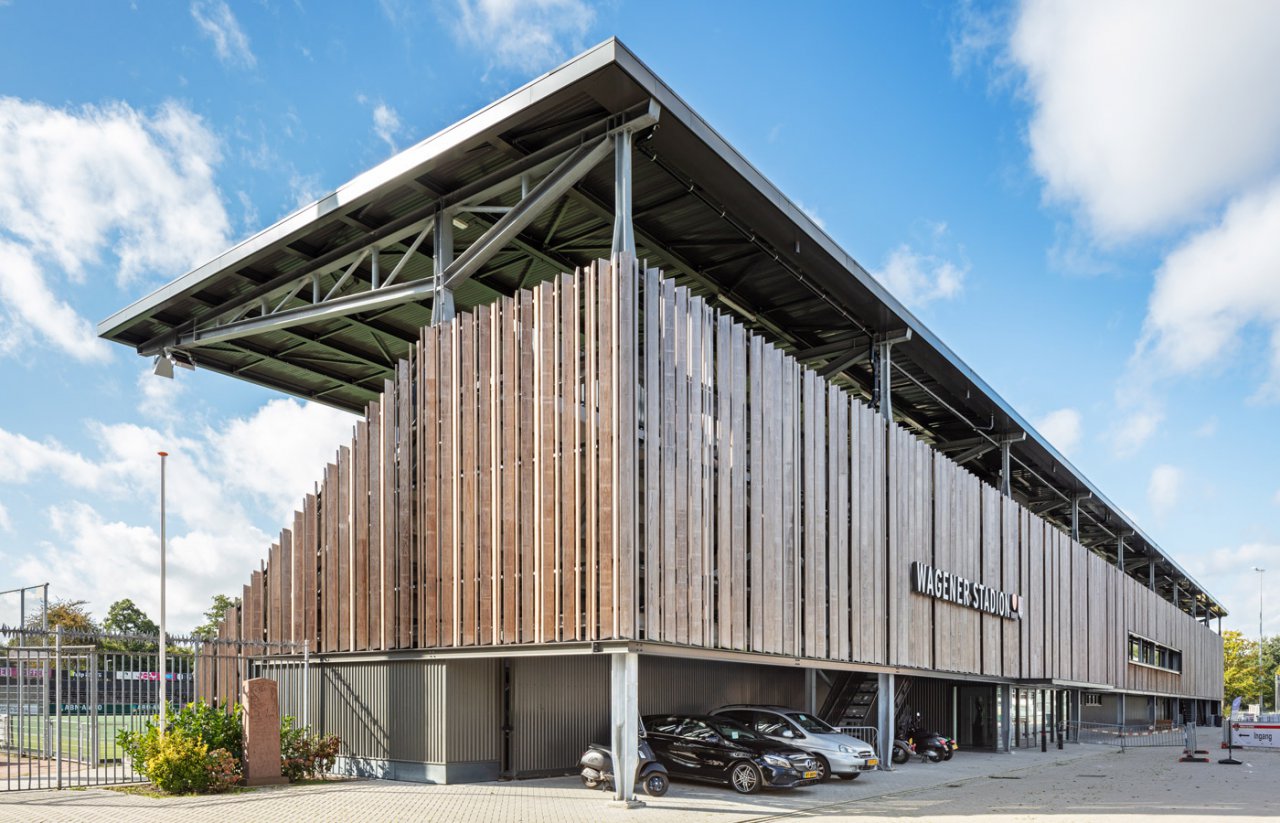Das neue Gebäude besteht aus vorgefertigten Betonteilen, die Überdachung der Tribüne aus einer Stahlhauptkonstruktion. An der Außenseite ist eine subtile, wellenförmige Holzverkleidung angebracht, die auf das Material der ehemaligen Tribüne und auf den für die Umgebung typischen Amsterdamer Wald verweist. Im Fall der zukünftigen Erneuerung der übrigen Tribünen, kann die Holzschale wie ein Kranz um das ganze Stadion herum gelegt werden.